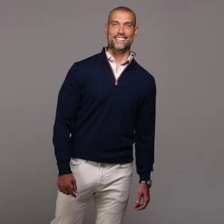 The Cashmere Touch Australian Merino Quarter Zip Sweater is the ultimate layering piece to complete any gentleman’s wardrobe. Crafted with the highest quality merino wool blend, this quarter zip sweater provides ultra soft breathability with durability – simple to wash and easy to maintain. Our special merino wool blend adds a luxurious feel without comprising the strength and longevity of this must-have sweater.