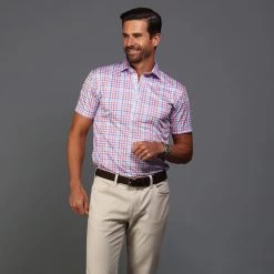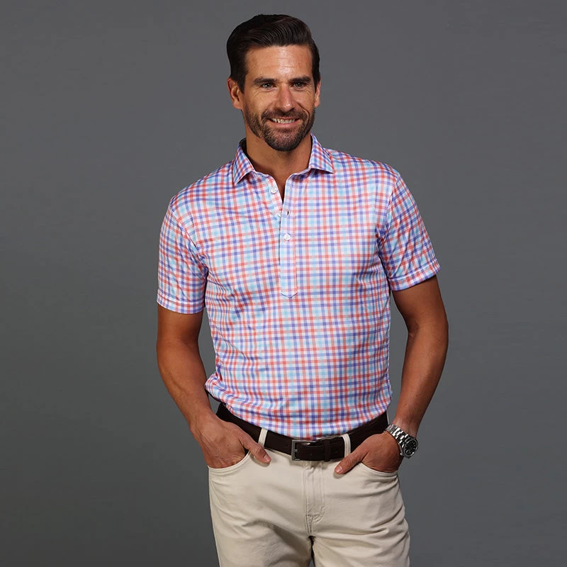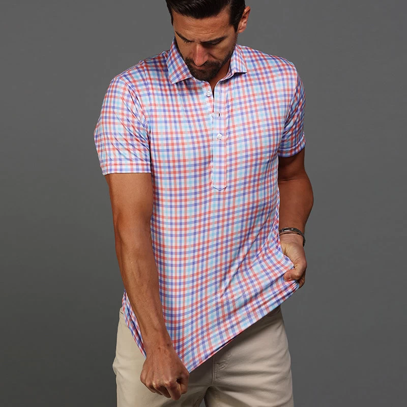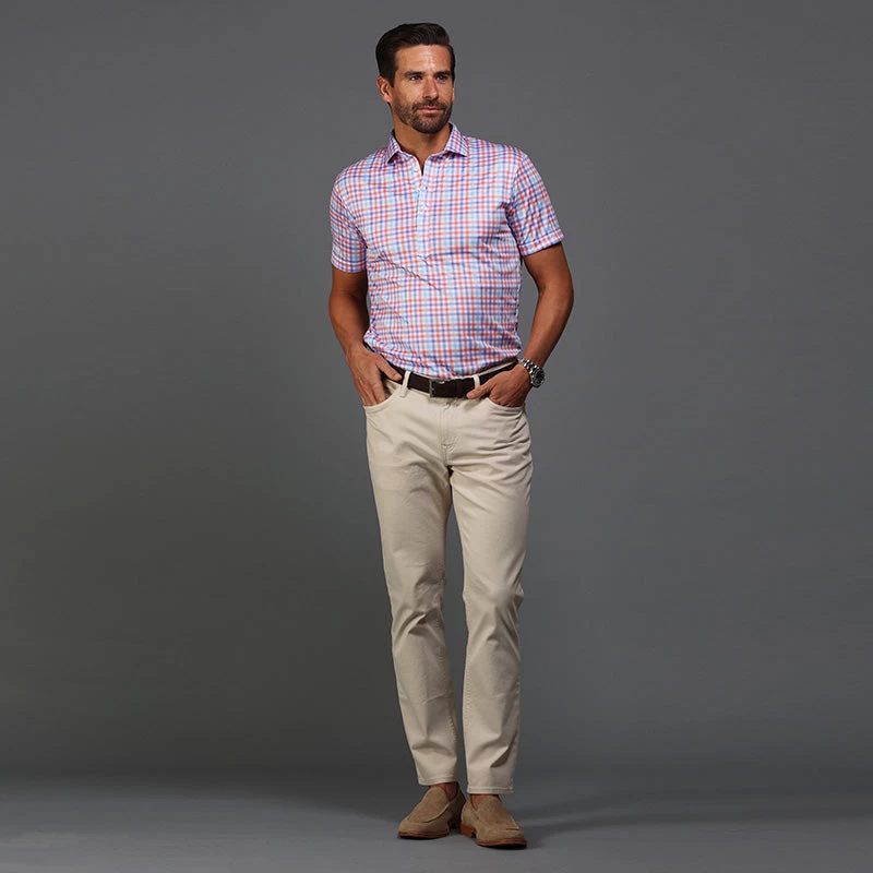 The versatile Semi-Spread Collar Polo – Slim Fit.. Woven for comfort and designed for style. This shirt pairs a formal semi spread dress collar with an extra comfortable, 4-way stretch, short-sleeved polo. The semi-spread collar has all the benefits of our ever popular English spread collar with a streamlined size and built to accommodate a larger tie knot
