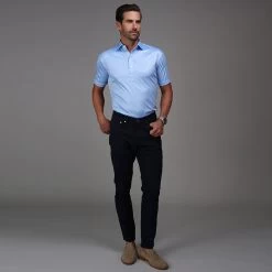 The versatile Semi-Spread Collar Polo. Woven for comfort and designed for style. This shirt pairs a formal semi spread dress collar with an extra comfortable, 4-way stretch, short-sleeved polo. The semi-spread collar has all the benefits of our ever popular English spread collar with a streamlined size and built to accommodate a larger tie knot